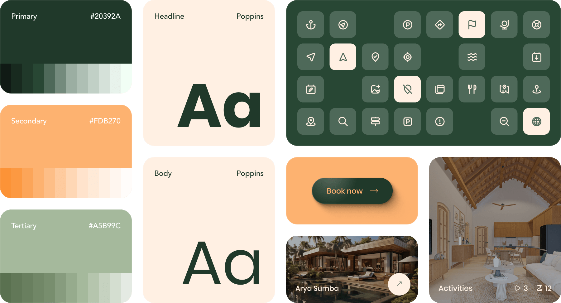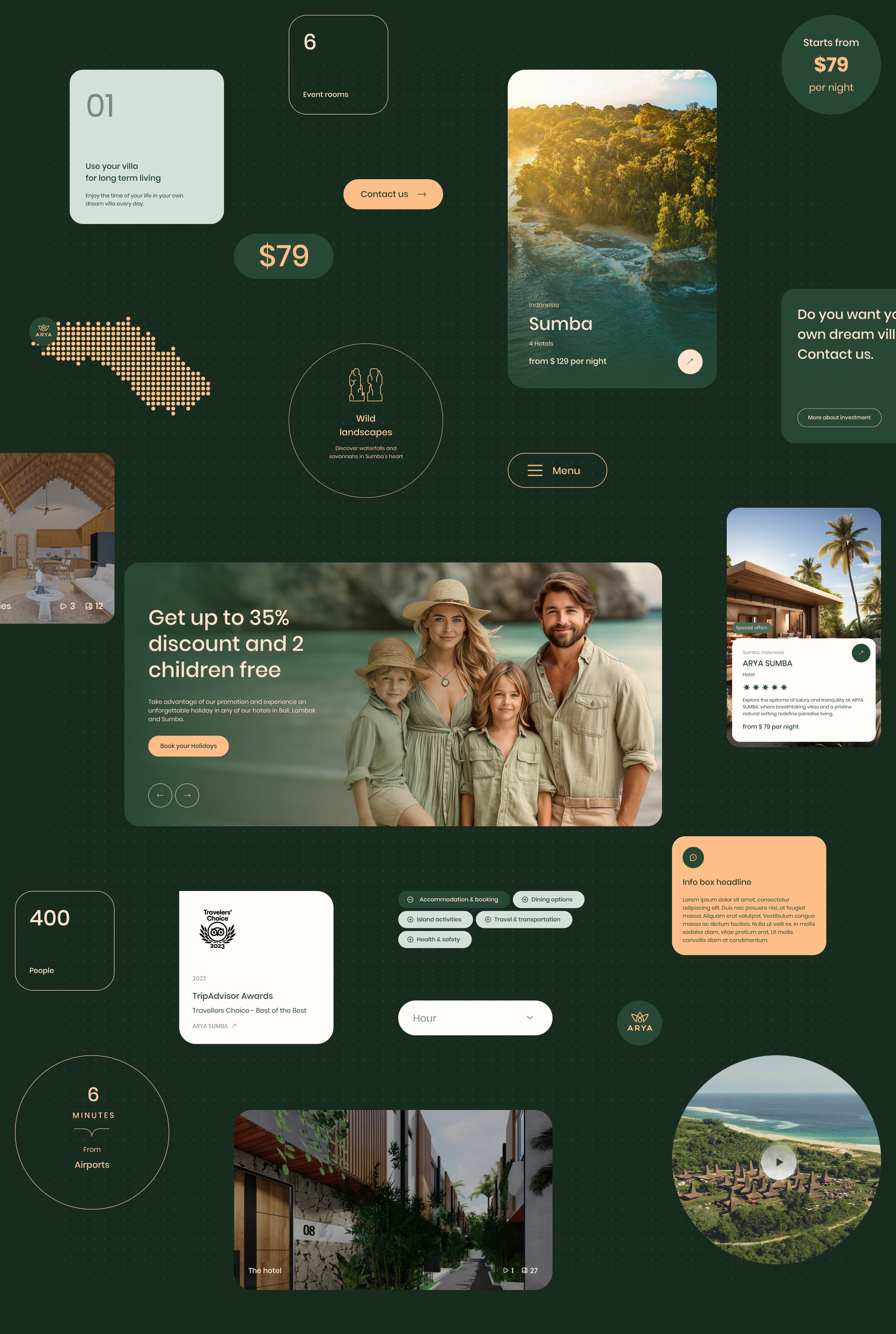 Část komponent přišla rovnou z Properties — cenové badge, CTA tlačítka, mapa Indonésie. Stačilo je přebarvit a fungovaly dál. Ale hotelový web si vyžádal i vlastní prvky: karty destinací s cenou za noc, bloky aktivit a zážitků, slevové sekce, počítadla vybavení. Každý nový prvek jsme navrhli tak, aby se dal kdykoliv přenést zpátky do Properties — a obráceně.