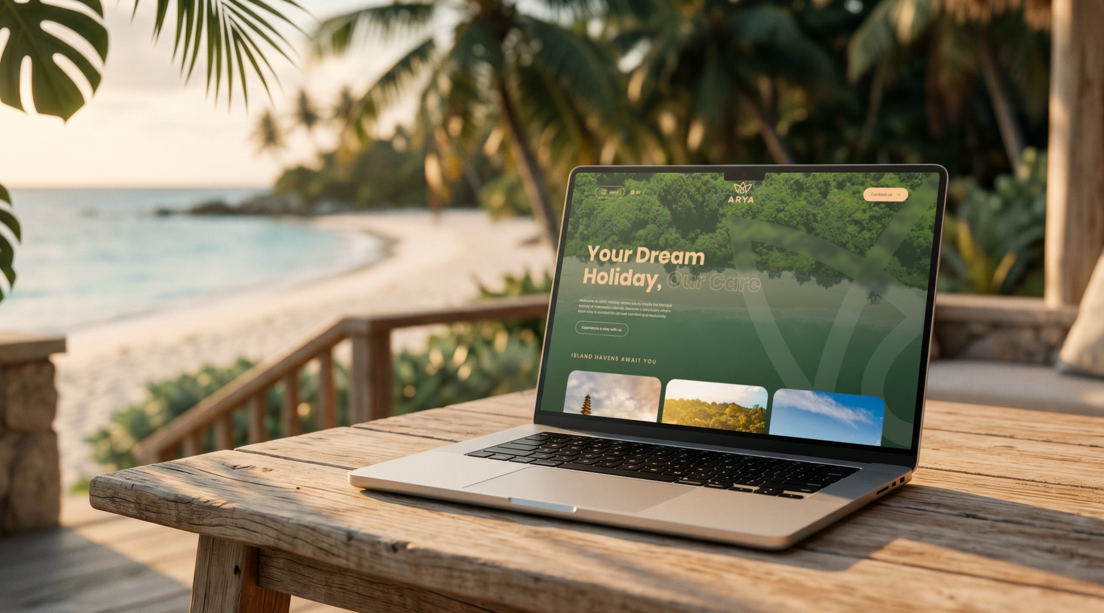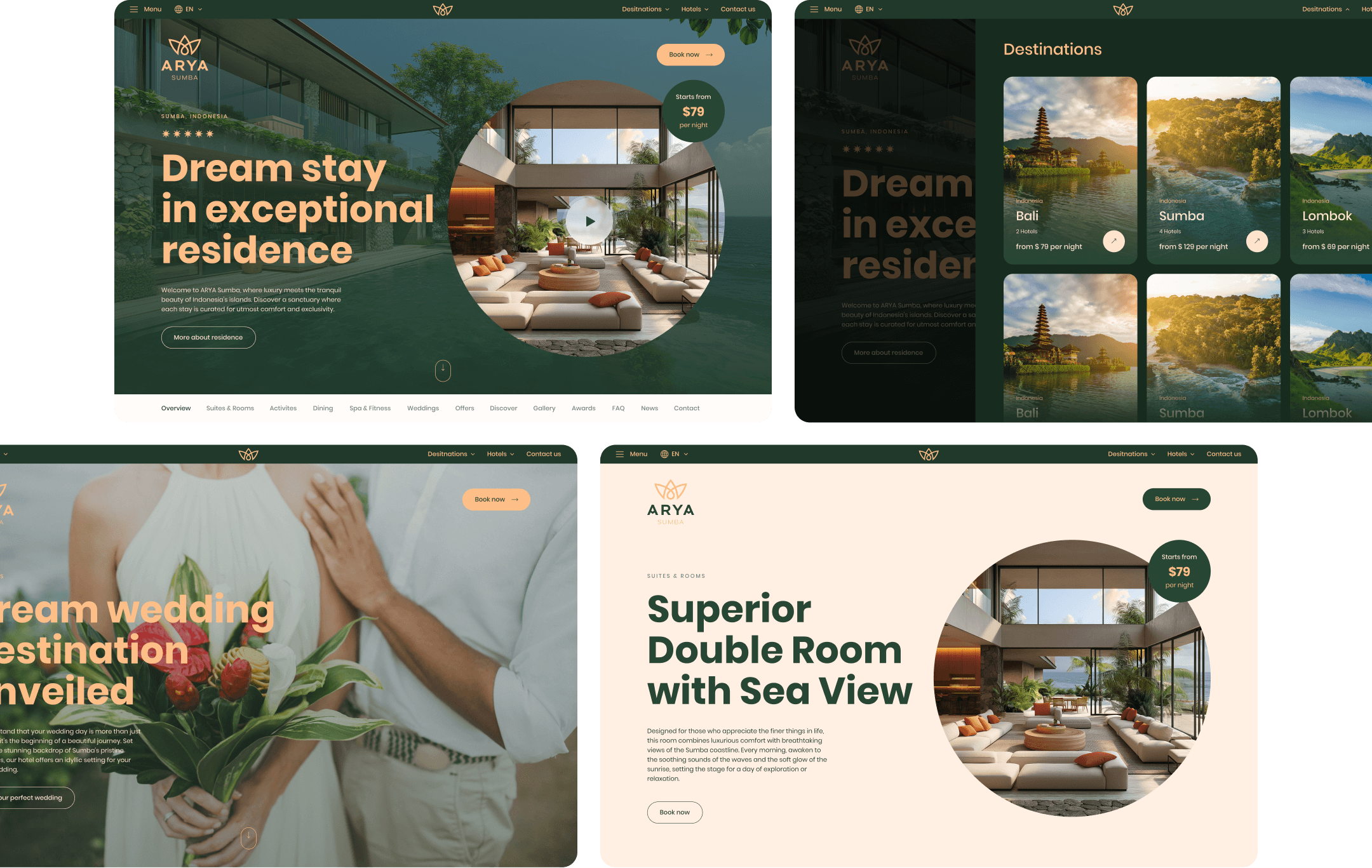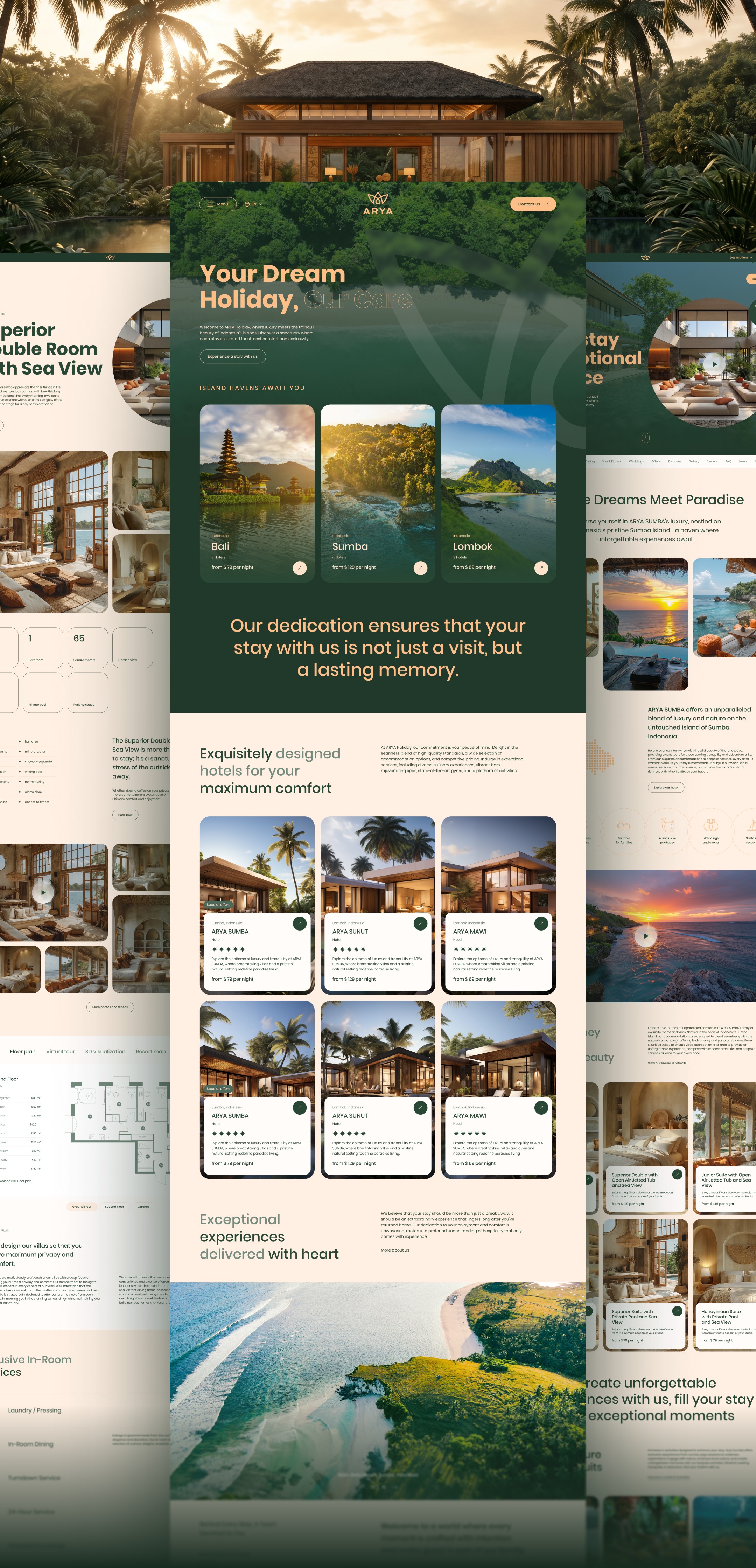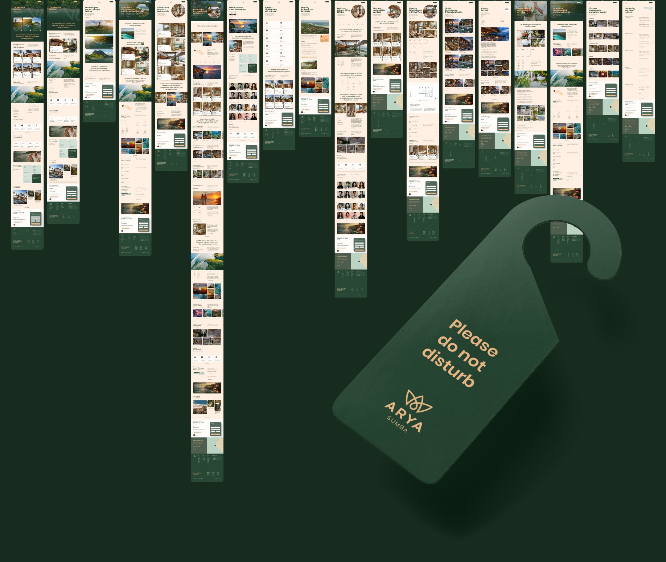 Druhý web pro ARYA, tentokrát pro hosty jejich resortů v Indonésii. Nová barevnost, nový tón — ale postavený na design systému, který jsme vybudovali už při prvním projektu. A přesně proto to šlo hladce.